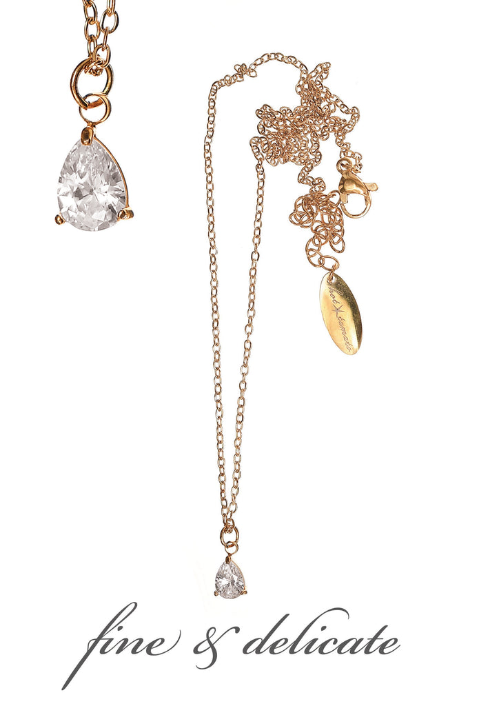 Available in Stainless steel natural ( silver colour) or stainless steel with 18ct gold plate. Durable and designed for everyday wear. Crystal teardrop pendant on a fine chain