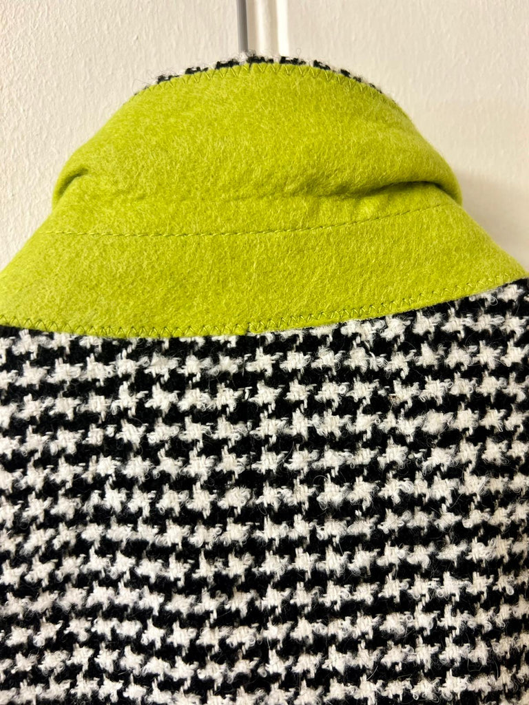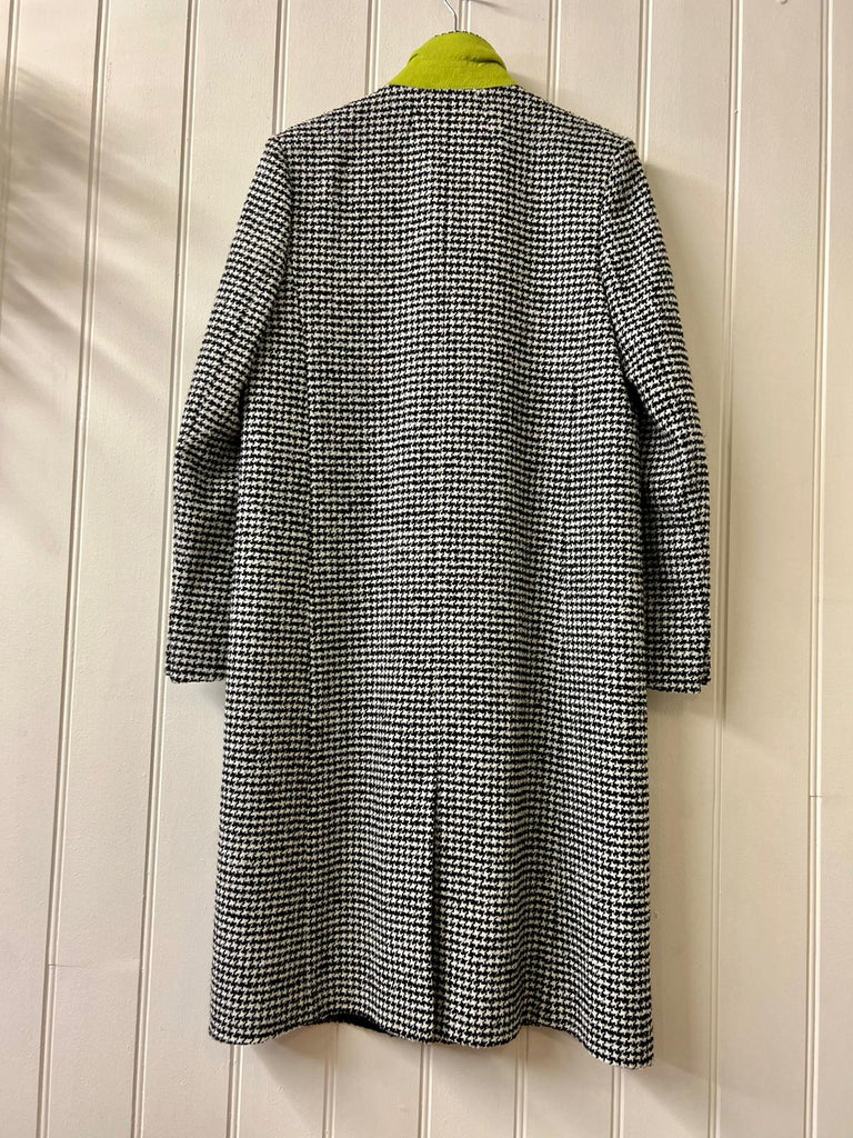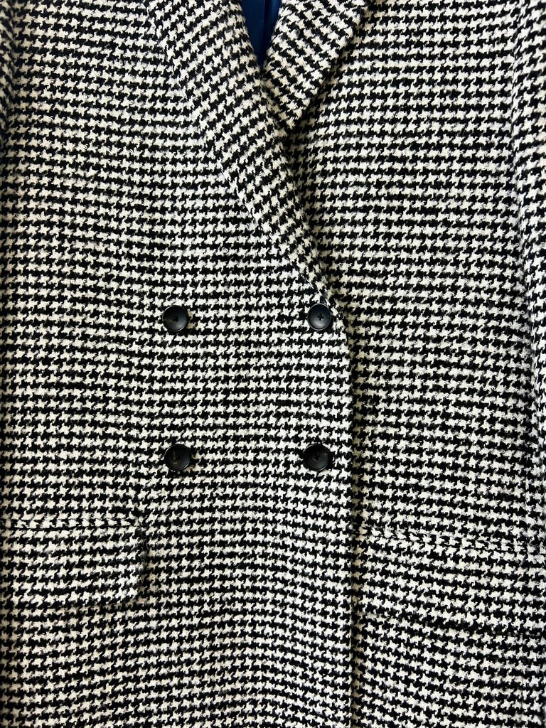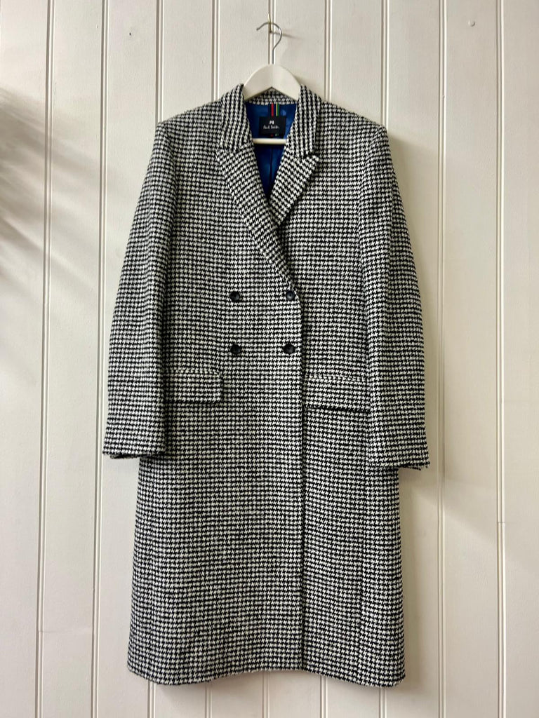 Preloved but in good condition P S by Paul Smith black and white check double breasted cost. 2 front pockets and back vent. Fully lined, body of coat black and blue and sleeves khaki lining
